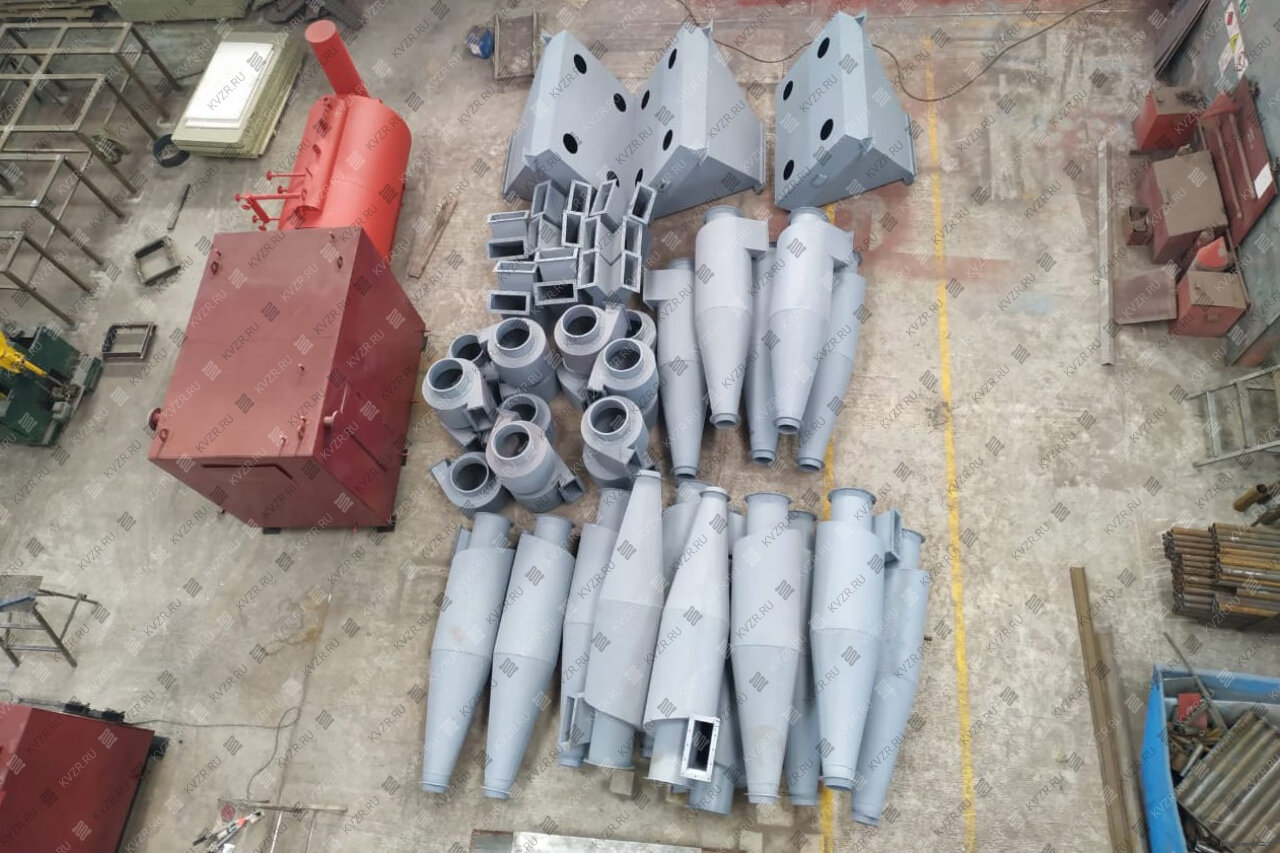 Выносные циклоны котла БЦ состоят из двух параллельно работающих секций. При небольших нагрузках шибером отключают одну из секций. Отключение секций при изменении нагрузок позволяет обеспечить оптимальную скорость движения газов в циклонных элементах. Секционирование уменьшает возможность ухудшения степени очистки газов за счет их перетока из одних элементов в другие через пылевой бункер. В качестве корпуса завихрителя используются чугунные конусы. Применение чугунного литья минимизирует абразивный износ стенок закрученным газовым потоком и значительно увеличивает срок эксплуатации агрегата.