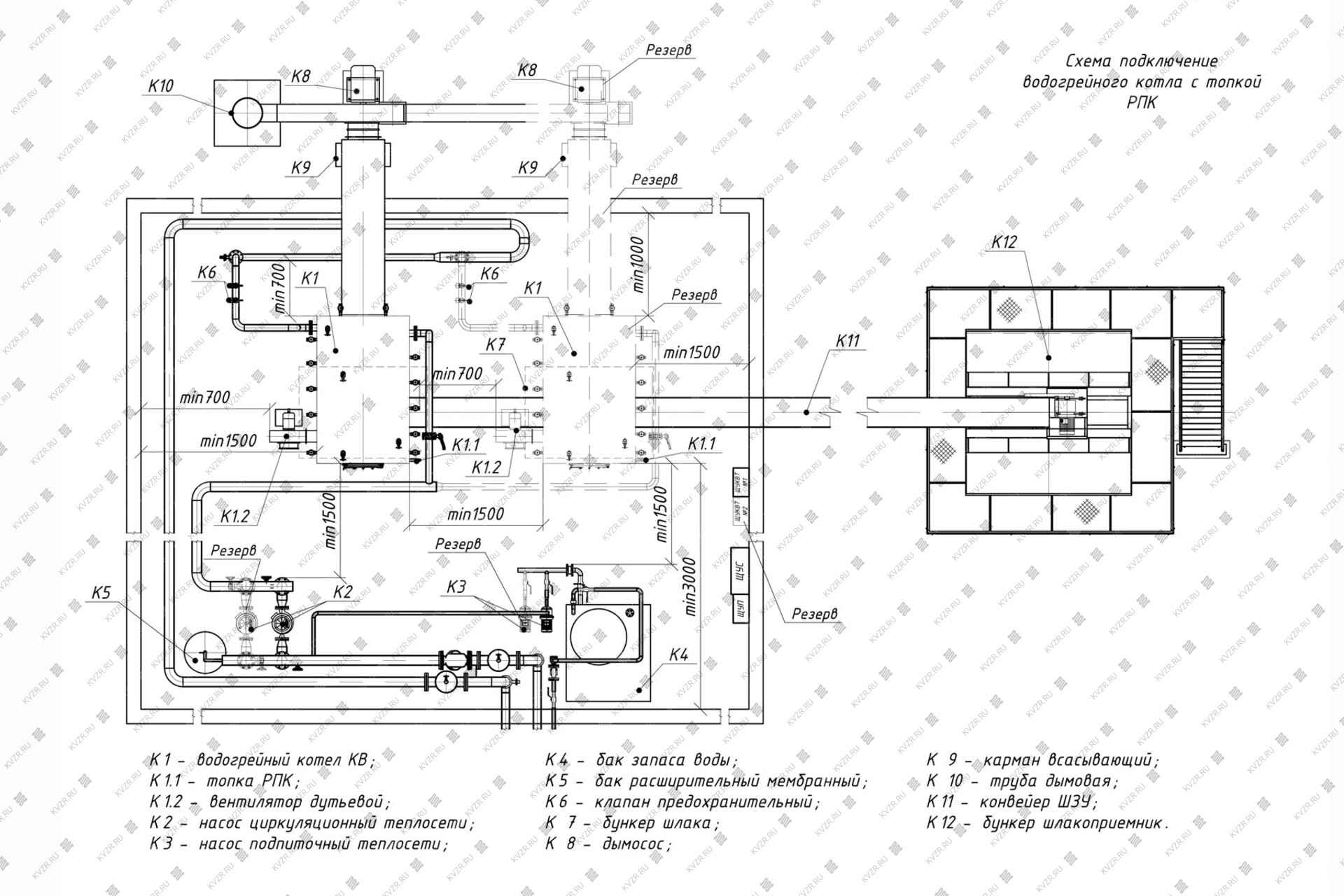 Чтобы правильно подключить котел КВм-0.35 с топкой РПК в котельной необходимо оставить проемы для обслуживания оборудования во время эксплуатации. На представленной здесь схеме указаны их минимальные размеры. Кроме того, в данной примерной схеме монтажа водогрейных котлов и оборудования указан перечень минимально необходимого вспомогательного оборудования для правильной работы котла.