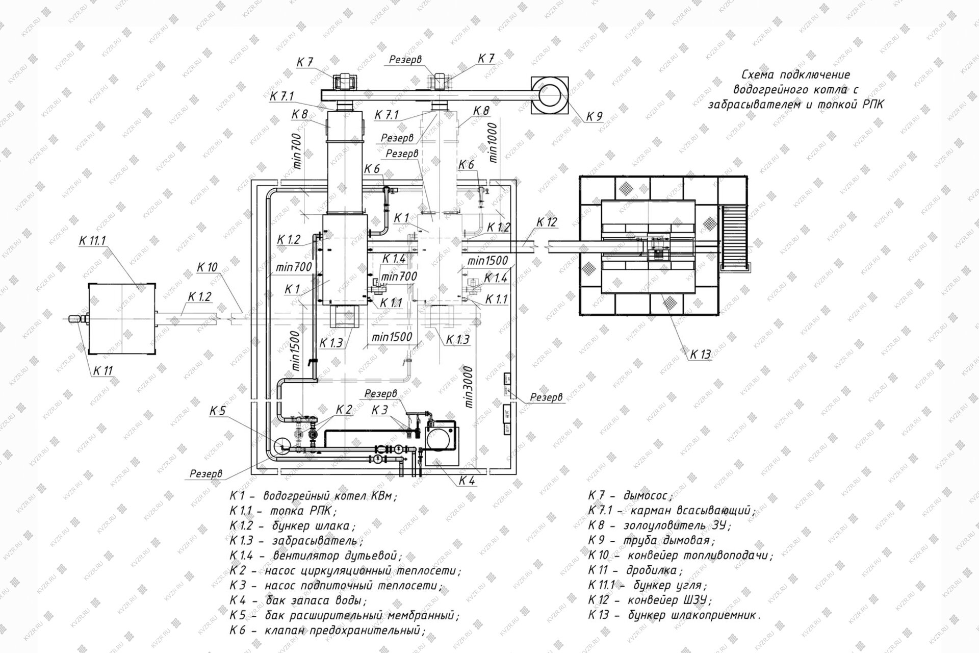 К вспомогательному оборудованию при подключении промышленного водогрейного котла КВм с ЗП РПК относят - щит управления котлом, насос циркуляционный, насос подпиточной воды, бак запаса воды, расширительный мембранный бак, транспортер, дымовую трубу, систему газоходов и дымосос, золоуловитель (по желанию).