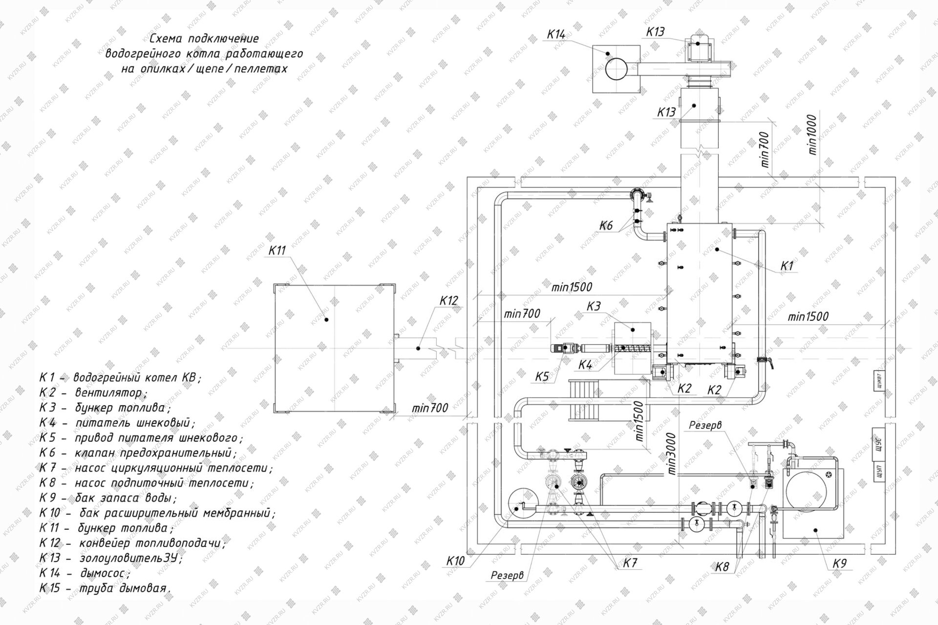 Чтобы правильно подключить котел 200 кВт на опилках в котельной необходимо оставить проемы для обслуживания оборудования во время эксплуатации. На представленной здесь схеме указаны их минимальные размеры. Кроме того, в данной примерной схеме монтажа водогрейных котлов и оборудования указан перечень минимально необходимого вспомогательного оборудования для правильной работы котла.